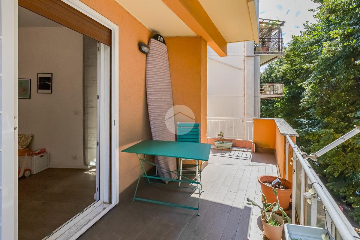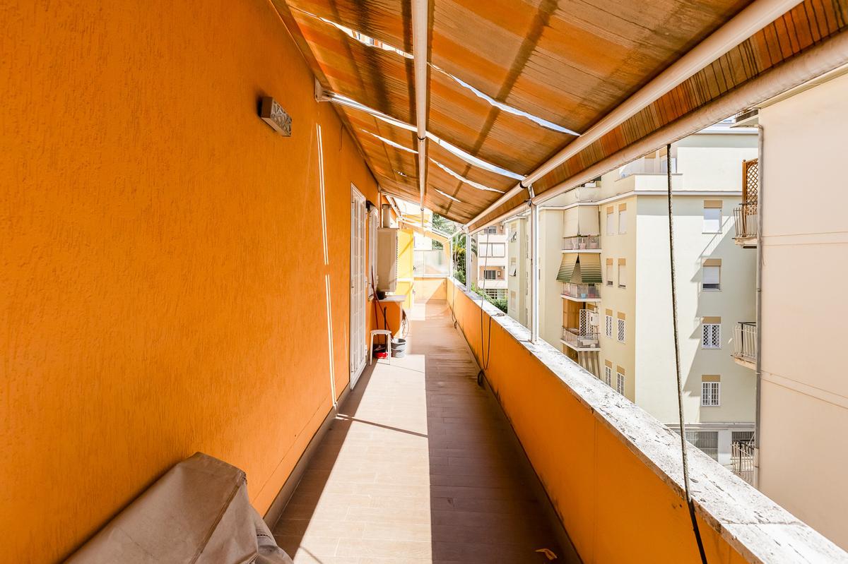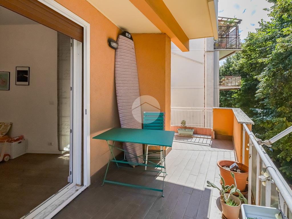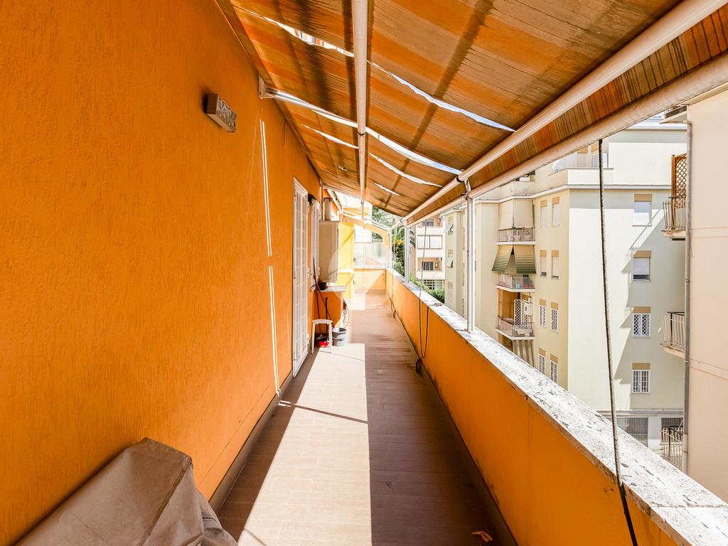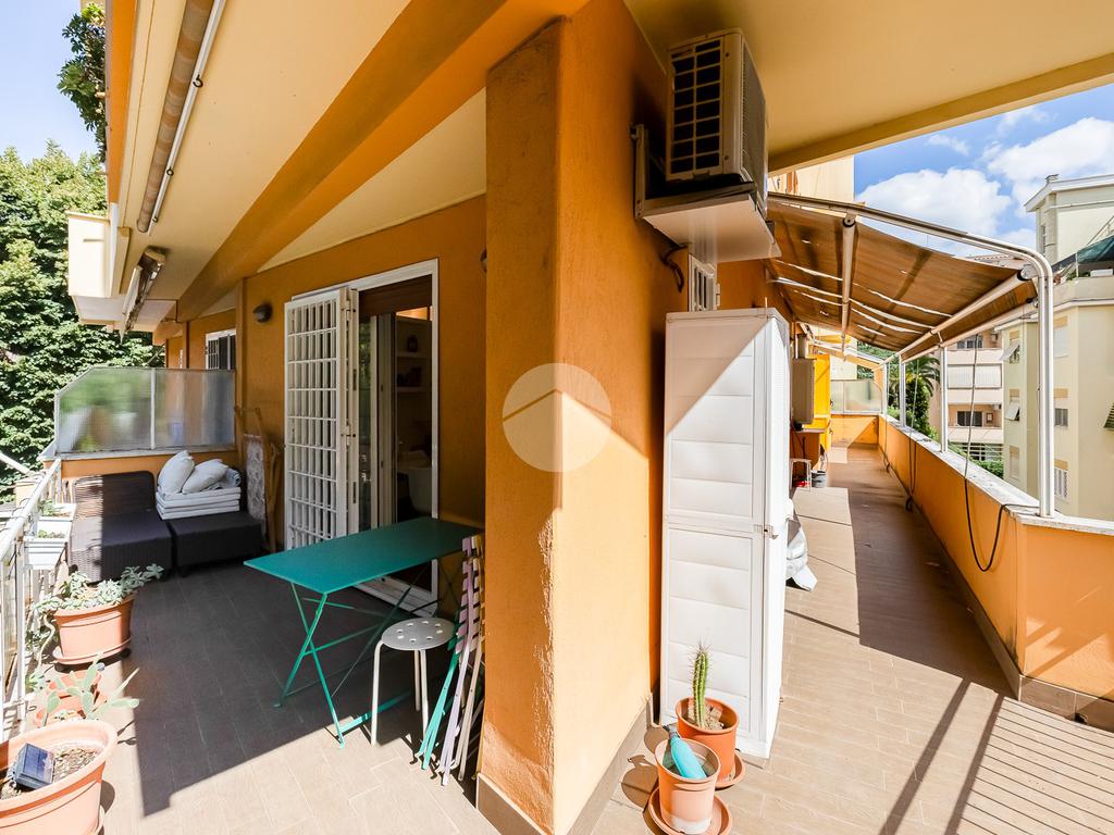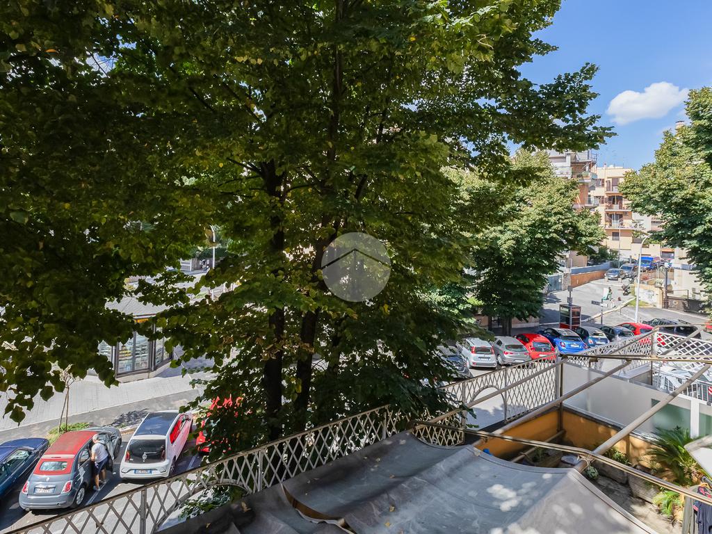 L’ingresso si apre su un corridoio che accompagna al soggiorno, un ambiente accogliente e luminoso con accesso diretto al terrazzo abitabile, dal quale si gode una piacevole vista aperta su Largo Gaetano De Sanctis. La cucina, separata e funzionale, è collegata anch’essa allo spazio esterno, garantendo continuità e praticità. La zona notte è composta da una camera da letto matrimoniale, anch’essa con accesso al balcone perimetrale che abbraccia l’intero appartamento, regalando luminosità a tutti gli ambienti. Completa la proprietà un bagno finestrato, rifinito con materiali moderni.