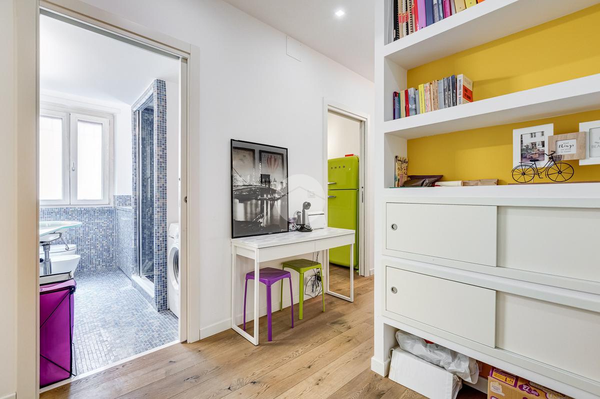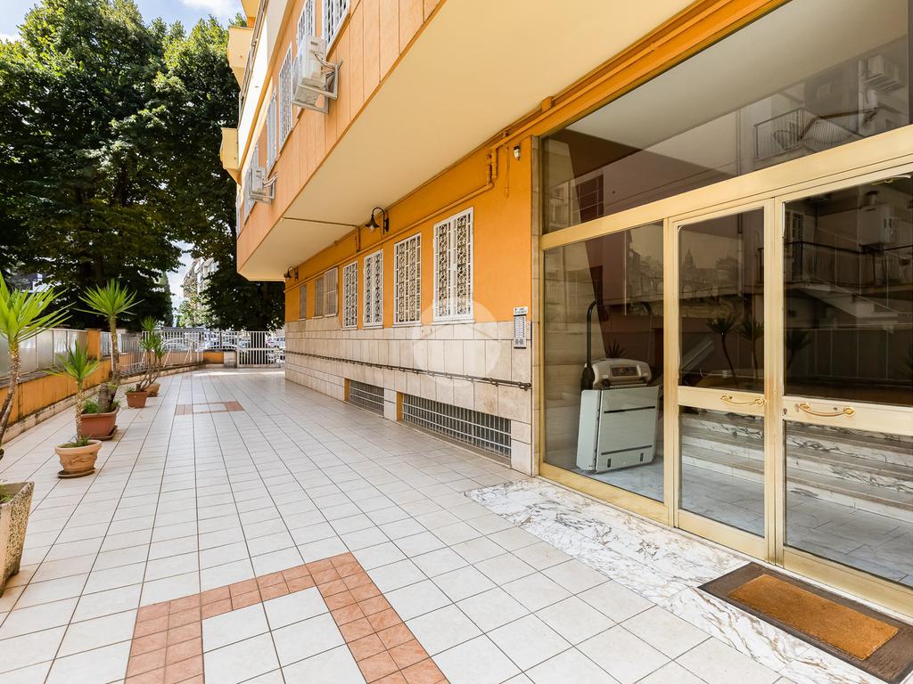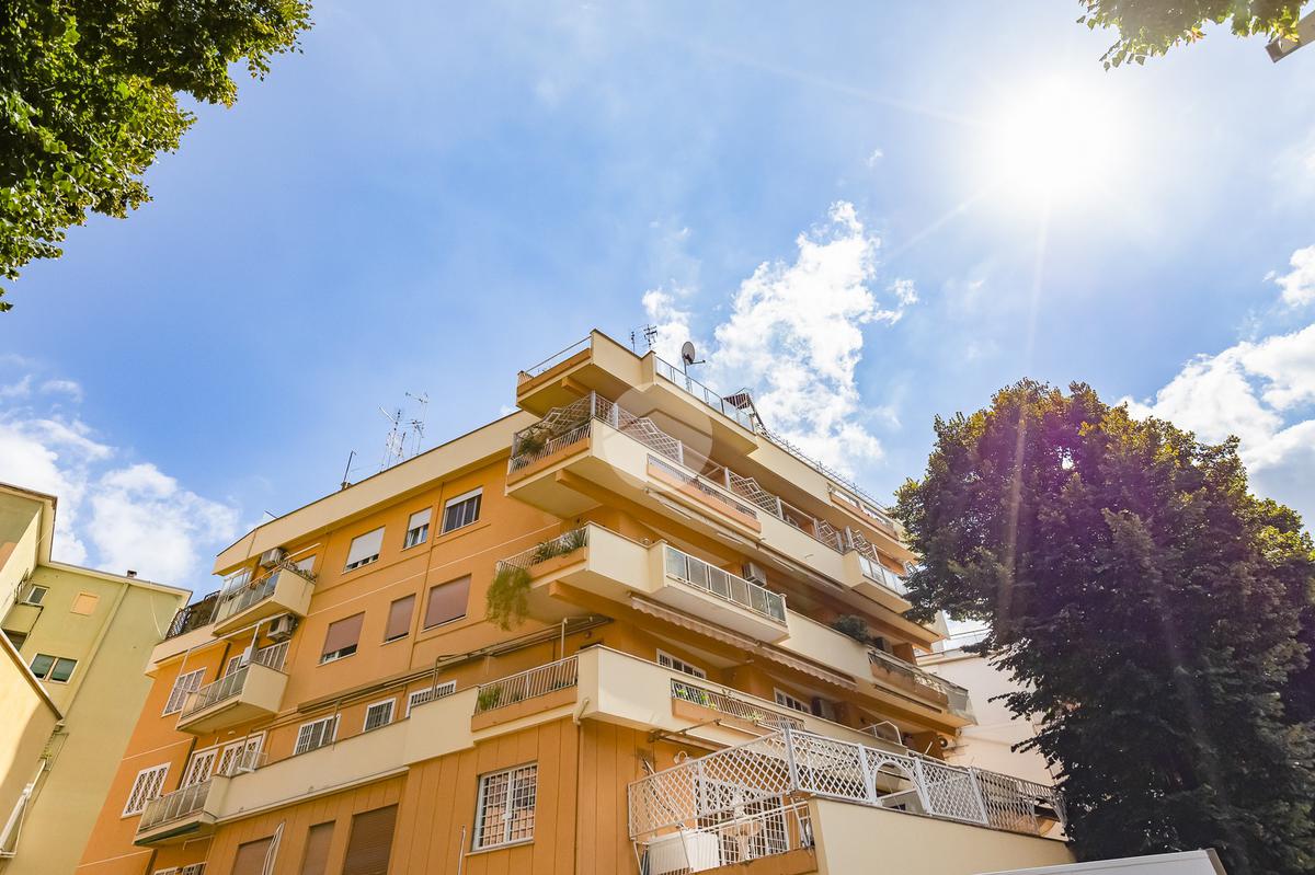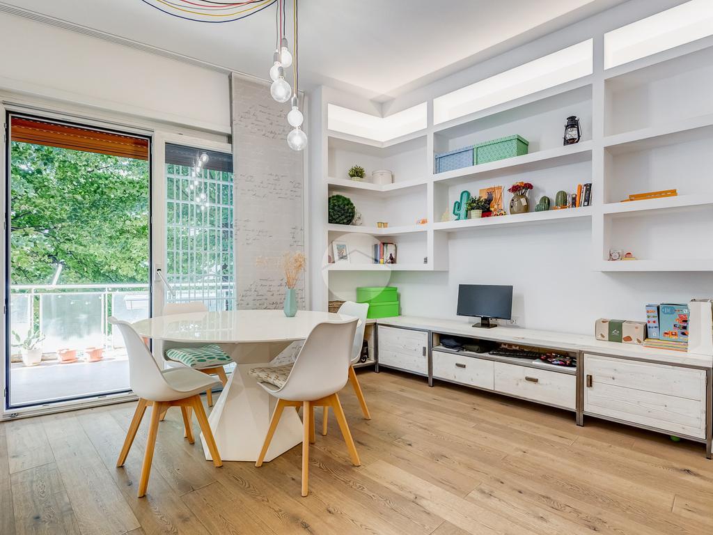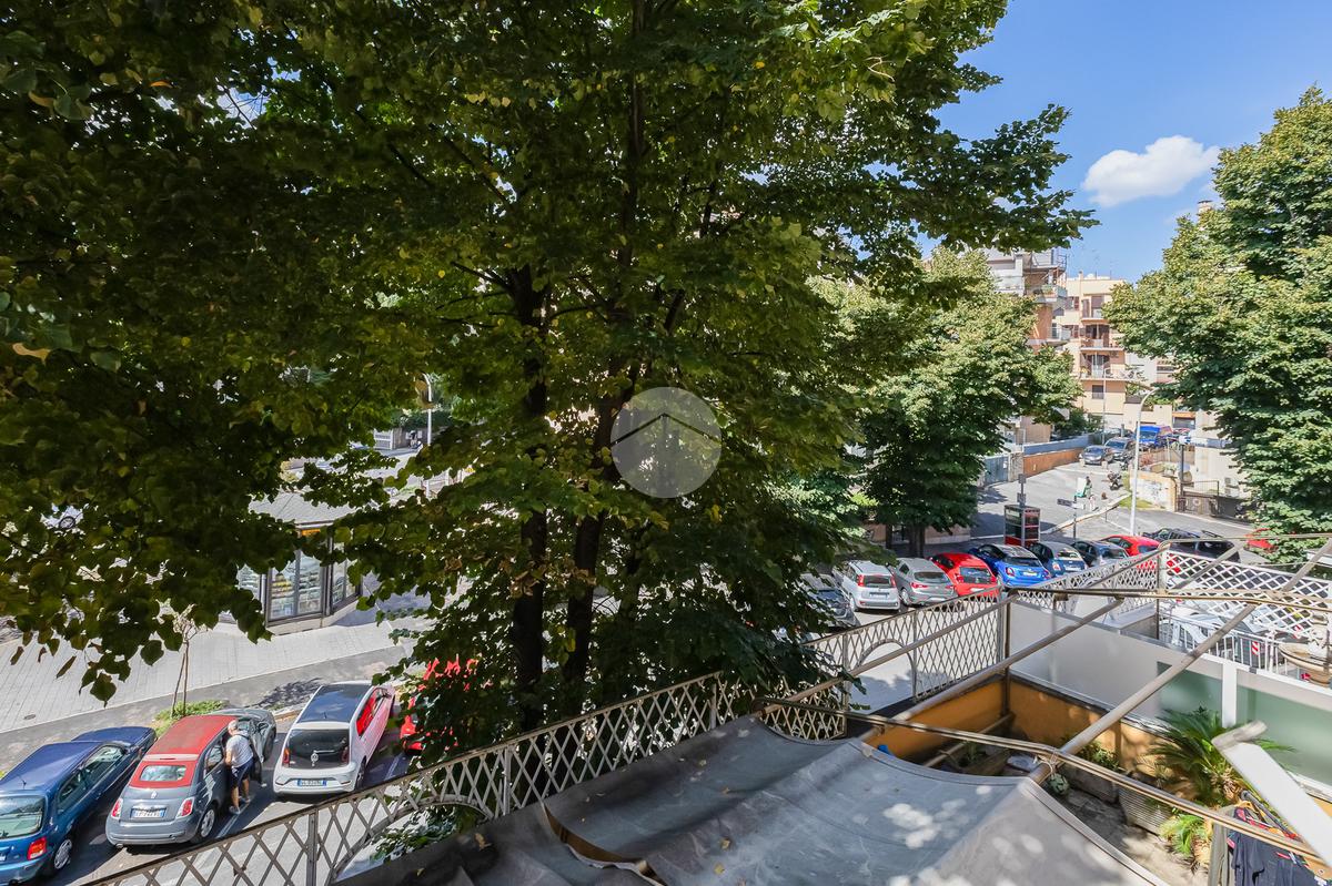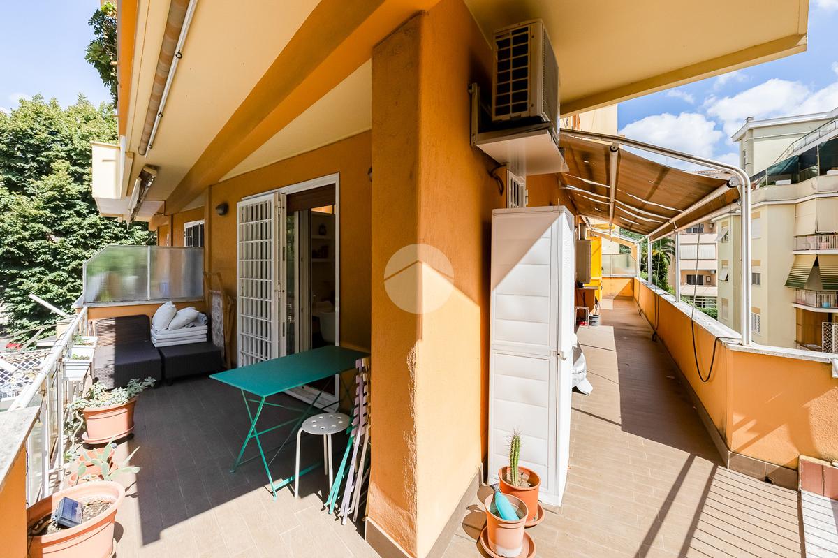 L’ingresso si apre su un corridoio che accompagna al soggiorno, un ambiente accogliente e luminoso con accesso diretto al terrazzo abitabile, dal quale si gode una piacevole vista aperta su Largo Gaetano De Sanctis. La cucina, separata e funzionale, è collegata anch’essa allo spazio esterno, garantendo continuità e praticità. La zona notte è composta da una camera da letto matrimoniale, anch’essa con accesso al balcone perimetrale che abbraccia l’intero appartamento, regalando luminosità a tutti gli ambienti. Completa la proprietà un bagno finestrato, rifinito con materiali moderni.