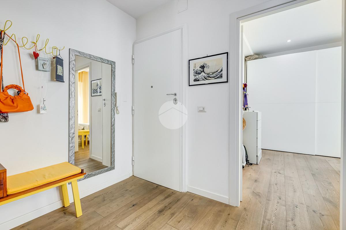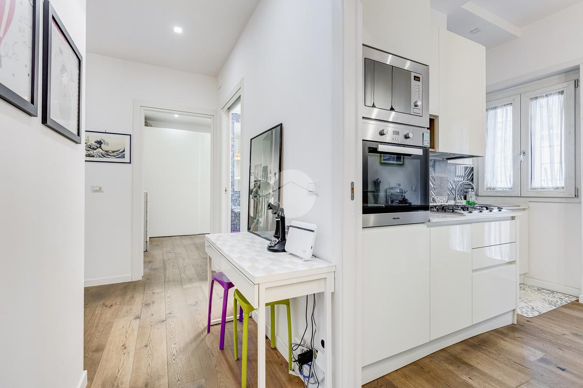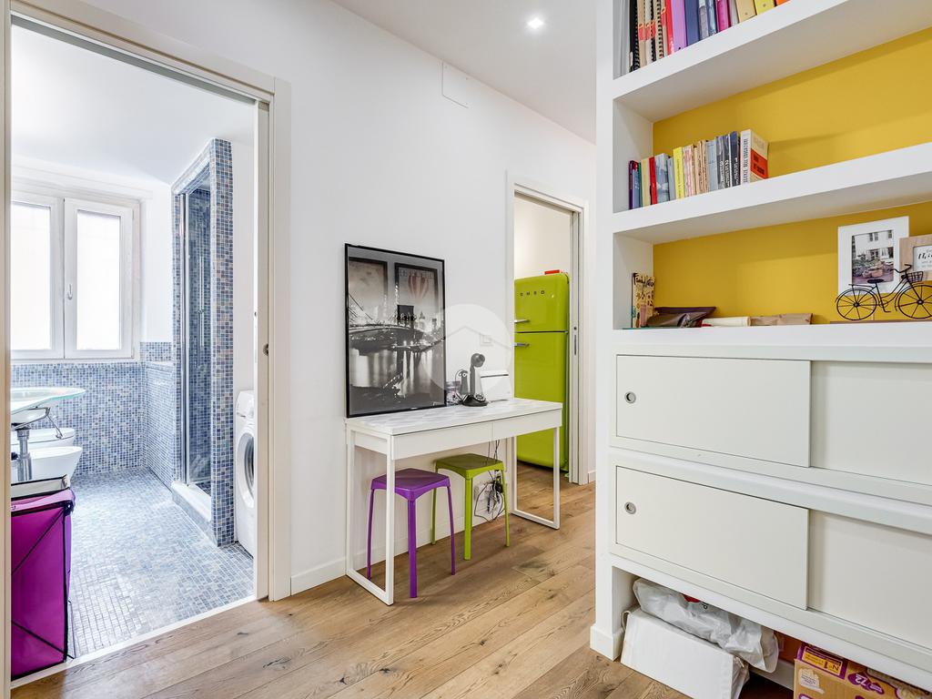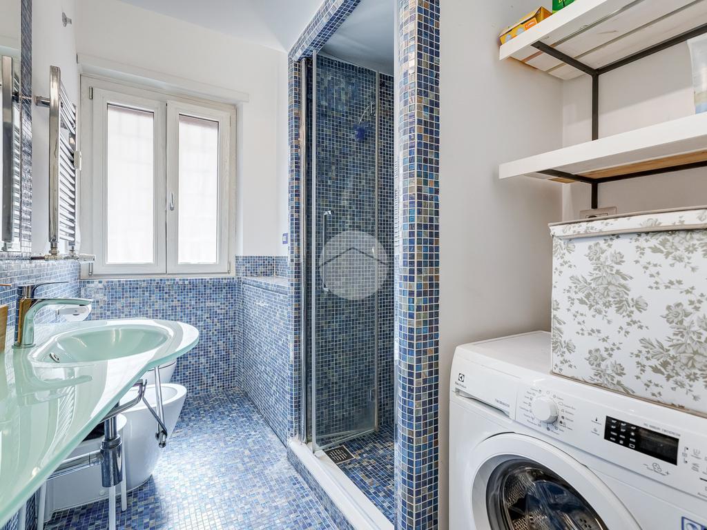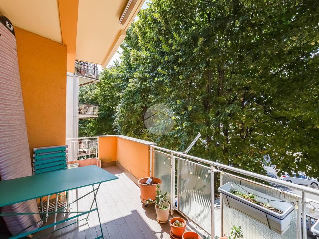 L’ingresso si apre su un corridoio che accompagna al soggiorno, un ambiente accogliente e luminoso con accesso diretto al terrazzo abitabile, dal quale si gode una piacevole vista aperta su Largo Gaetano De Sanctis. La cucina, separata e funzionale, è collegata anch’essa allo spazio esterno, garantendo continuità e praticità. La zona notte è composta da una camera da letto matrimoniale, anch’essa con accesso al balcone perimetrale che abbraccia l’intero appartamento, regalando luminosità a tutti gli ambienti. Completa la proprietà un bagno finestrato, rifinito con materiali moderni.
